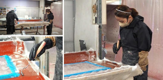 照井課長)若菜さんが担当しているのは「型から製品を抜く」という作業で、技術のいる仕事です。また、我々の仕事は手作業で成形用の型に材料を積層させて、さまざまなFRP(強化プラスチック)製品をつくっていくのですが、その基となる型の整備も大事な作業です。そこで手を抜いてしまうと製品全部に影響が出てしまうので、すごく大事な部分を若菜さんには担当してもらっています。